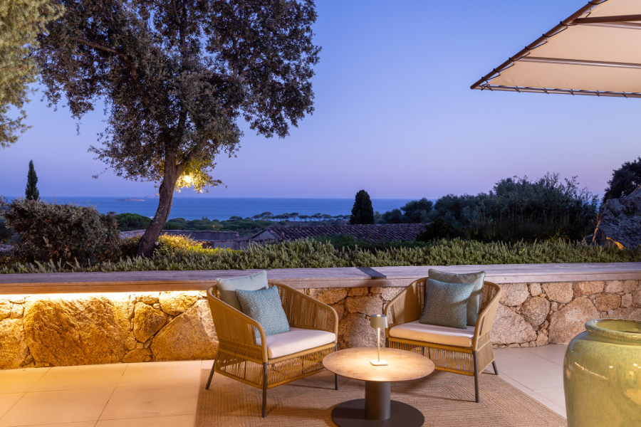 The infinity pool opens onto sweeping views of the Mediterranean, stretching toward the Cerbicales Islands and, on clear days, the shores of Sardinia.