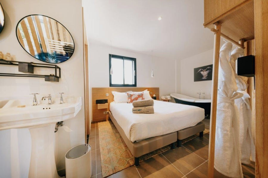 Enjoy spacious interiors with an open-plan bedroom and living area, an elegantly integrated bathtub, a separate shower, and a fully equipped kitchen.